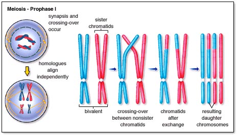 But there is a second process called crossing over that happens during prophase 1 when the bivalents are formed. As you can see in the diagrams, small sections of chromatid can be swapped between the chromatids of one chromosome and with its homologous partner. This ensures that when the individual chromatids are separated in meiosis 2, each is different to each other. This multiplies up the genetic variation by several orders of magnitude. (see diagram below)