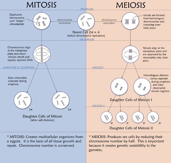 In sexually reproducing organisms two types of cell division are needed. One is for the processes of growth, repair and asexual reproduction and it is called mitosis. Mitosis produces daughter cells that are diploid and genetically identical to the parent cell.