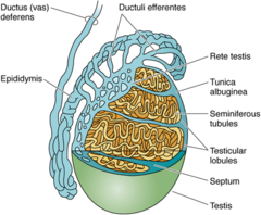 Humans have over a hundred meters of seminiferous tubules in total in both testes and this allows sperm cells to made at a very fast rate. Even though it takes around 75 days to make an individual sperm cell, the testes make them at a rate of around 85 million sperm cells per day. The epididymis is found next to the testis in the scrotum and is a coiled tube in which sperm cells continue to develop and mature. Sperm are stored here too in readiness for ejaculation.
