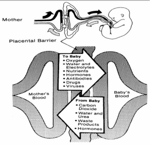The main function of the placenta then is to allow the exchange of materials between the foetal and maternal circulations. The developing foetus inside its mother’s uterus has no direct access to oxygen nor food molecules of course yet both are needed to allow healthy development. The foetus also needs a mechanism to get rid of the waste molecule, carbon dioxide that is being produced in all its cells all the time. Until the kidneys mature fully the foetus also has to get rid of urea, another excretory molecule that could build up to toxic concentrations unless removed from the growing foetus.