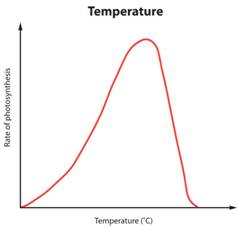 Temperature – many reactions in photosynthesis are catalysed by enzymes and enzymes are very affected by temperature: too low temperatures and the enzymes and substrate molecules move very slowly and so there are few collisions, too high temperatures and the enzymes change shape (denature) so the substrate molecules cannot fit into the active site.