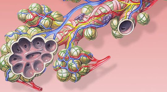 This diagram above shows the bronchial tree – the branching network of tubes that carry air into the lungs. The trachea at the top branches into the right and left bronchi, then each in turn branch into smaller bronchi and finally into the smallest tubes called bronchioles. Bronchioles carry air into a cluster of tiny airsacs called alveoli (not ravioli as AZB told his F division today…)