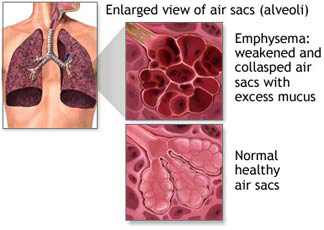 Emphysema is a disease in which the thin walls of the alveoli break down. Tar droplets condense onto the alveolar wall, making them rigid and inflexible. Smokers are coughing a great deal to remove the mucus from their lungs and this coughing can cause the sticky, rigid tar coated alveolar wall to degenerate.
