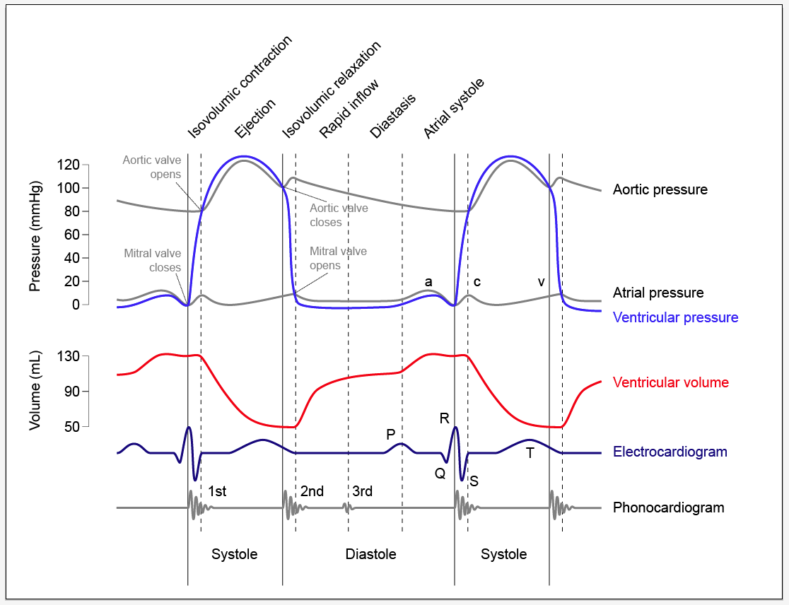 Look at the graph of pressure changes below. You can see the mitral valve (I hate that name) is closed as soon as the ventricular pressure exceeds the atrial pressure and it opens again during ventricular diastole as the pressure in the ventricle drops.