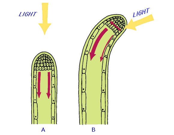 The detailed mechanism of positive phototropism in shoots is not well understood but we do know that if the shoot has brighter light on one side than the other, auxin will be moved towards the darker side of the shoot. This lateral redistribution of auxin allows the darker side to grow faster, so the shoot bends towards the light.