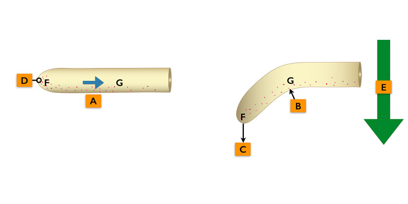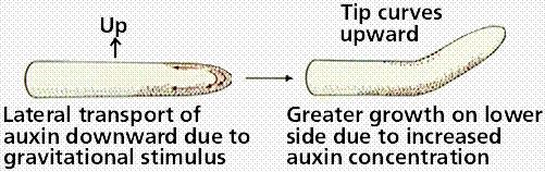 This diagram shows auxin moving downwards in a shoot under the influence of gravity. The lower side has a higher concentration of auxin and so grows faster. This results in negative geotropism in the shoot: it will grow in the opposite direction to gravity.