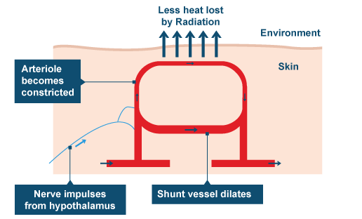 This is the main effector mechanism in human thermoregulation but it is also the one that tends to catch exam candidates out. Please make sure you understand this process fully and can explain this section of work very well indeed. If the body is getting too cold, the pattern of blood flow switches in the skin so less blood flows in the capillary beds near the surface of the skin and more blood is retained deeper in the skin structure. This is achieved by narrowing the arterioles that supply the capillary beds near the surface (arterioles and arteries have plenty of muscle in their walls that can contract to narrow the lumen of the blood vessel) This narrowing of arterioles is called vasoconstriction.